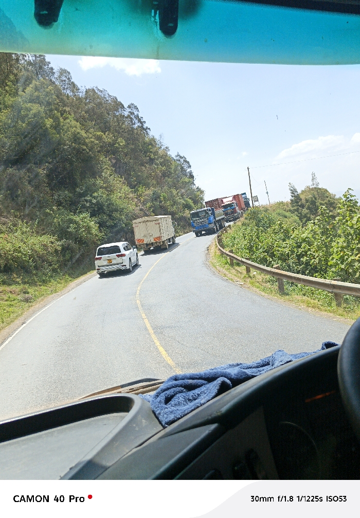 A winding asphalt road is seen from inside a vehicle. A white car follows a box truck. Further ahead, two trucks are visible, navigating the curve. Lush green vegetation covers the hillside on the left and right of the road. A metal guardrail lines the right side. Overhead, the sky is bright with a few clouds. Part of the vehicle's interior is in the foreground, including the dashboard.