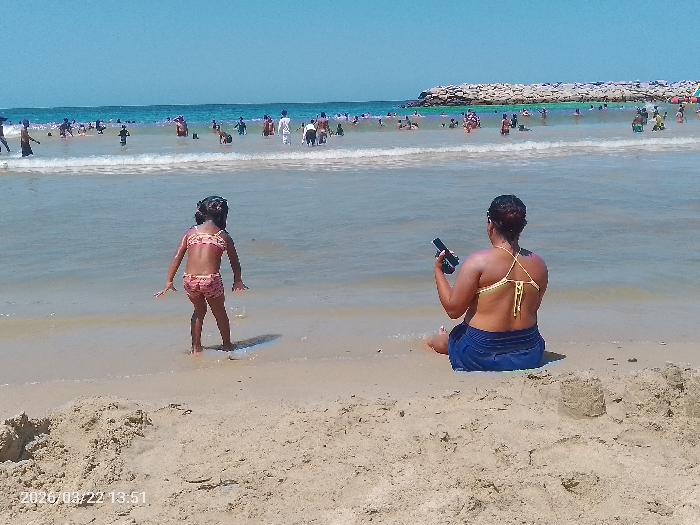 This image depicts a beach scene in Caraballeda, Venezuela, recorded on 2020/03/22 at 13:51. In the immediate foreground, a sandy beach is visible, with a small sand formation present on the left. An adult, observed from behind, sits directly on the sand wearing a light-colored halter-style bikini top and dark blue shorts, actively holding a black smartphone. To the left of the adult, a young child, also facing away from the camera, stands in the shallow water near the shoreline, wearing a patterned two-piece swimsuit. The midground and background show numerous individuals wading, swimming, or standing in the ocean under a clear blue sky. A rock breakwater extends from the right shoreline into the water in the distance.