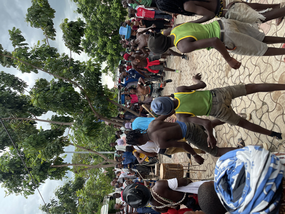 The image captures a lively gathering of people in an outdoor setting, likely a public space in Bariadi, Tanzania, at coordinates -2.803 latitude and 33.988 longitude. The scene is vibrant with a mix of individuals, primarily young men and women, engaged in a performance or celebratory activity. A group of men are dancing in the center of the scene, their movements animated and expressive. To the left, two men are playing drums, providing the rhythmic heartbeat of the event. Some spectators stand around the edges, watching and interacting with the performers. The environment is characterized by lush green trees and a paved ground, likely a common feature of the town's public areas. The attire of the participants, featuring casual clothing and traditional African garments, reflects the diverse cultural aspects of the community. The mood is celebratory and energetic, suggesting a festive occasion or a cultural event.