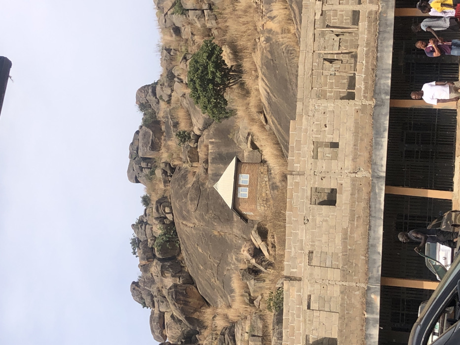 The image depicts a scene on Rukuba Road, Nigeria. The background is dominated by a large rocky hill composed of numerous grey-brown boulders and exposed rock faces, interspersed with sparse, dry, light brown vegetation and a few small green trees. A single, small, brick building with a light-colored pyramidal roof and two white-framed windows is situated on the lower slope of the hill. Below the hill, a two-story building is visible. The upper floor is under construction, featuring light grey concrete blocks with multiple unfinished rectangular openings for windows and doors. The lower floor is completed, displaying dark, grilled shopfronts or entrances separated by vertical orange columns. In the foreground, partially visible on the left, is the dark bonnet and windshield of a vehicle. A dark-skinned male in a dark sleeveless shirt and dark trousers stands near a lighter-colored vehicle, holding a dark hose or cable. To the right, a group of five individuals is gathered in front of the lower building. One male in a white t-shirt and light trousers stands looking to the right. Another male in a blue and red striped t-shirt appears to be interacting with a younger male in a yellow t-shirt and dark shorts, who is extending his hand. Other individuals are partially visible in the group. The scene is illuminated by bright daylight under a clear, light blue sky.
