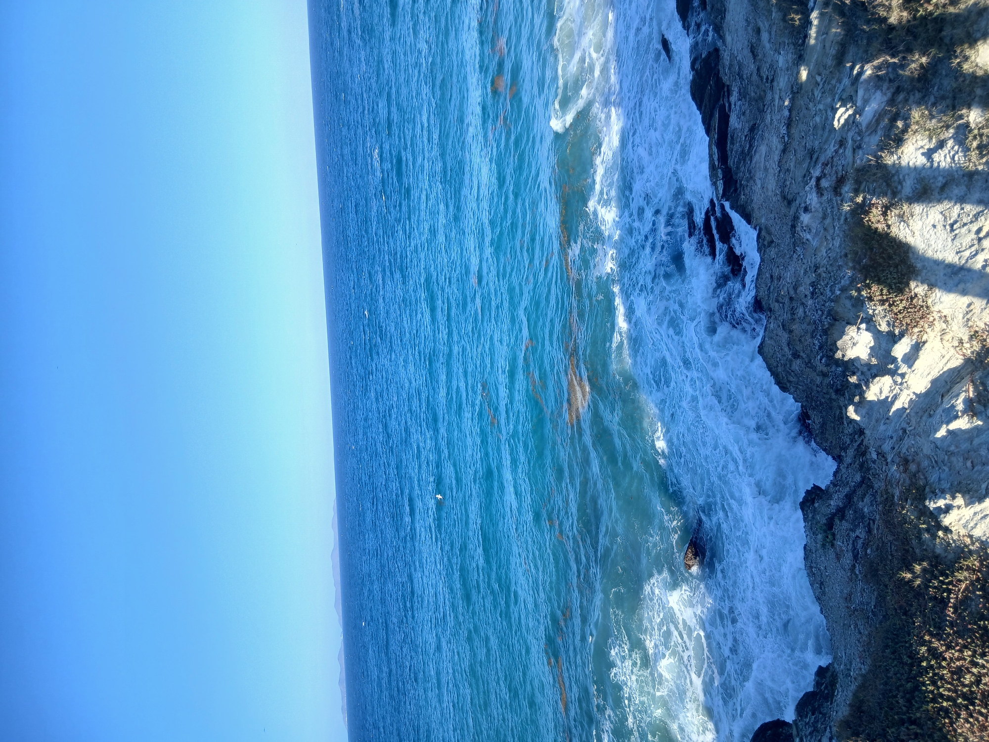 A shoreline scene, possibly near a cliff, features a rocky coast where waves are crashing against the rocks. The sky is blue and clear. The image seems to be taken during the day. Location: Unknown, Unknown.