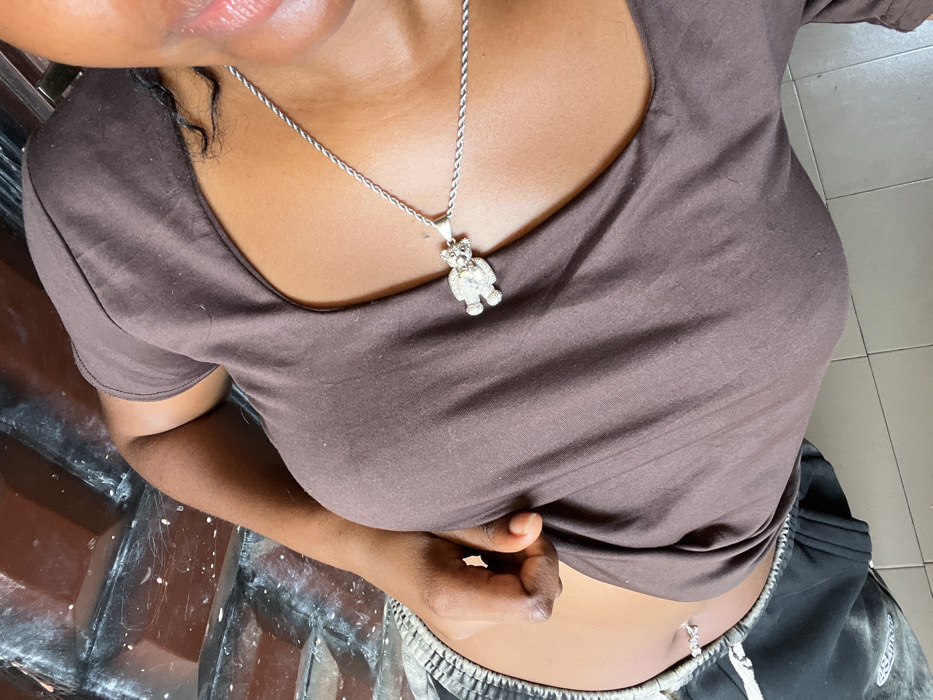 A close-up, overhead perspective shot captures the torso of an individual in Ipetumodu, Nigeria. The person has dark skin and is wearing a short-sleeved, dark brown top with a low neckline. A silver-colored rope chain necklace with a cubic zirconia-encrusted teddy bear pendant is visible on their chest. The lower abdomen and waist are partially exposed, revealing a navel piercing. The individual's left hand, with a closed fist, rests near the waistline, adjacent to the visible black or dark grey athletic shorts/sweatpants with a white stripe and "4Stmore" branding on the left leg. The immediate background above the waist features a dark, reflective surface with white streaks, while the floor below the waist is composed of light-colored tiles.