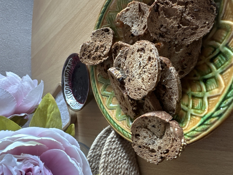 The scene depicts a still life arrangement on a light-colored wooden table within a residential setting in Aktanysh, Russia. In the foreground, a round ceramic plate with an ornate green and yellow geometric pattern holds a pile of dark brown, circular, multi-grain rusks or crisps, many visibly containing seeds. To the upper center-right, a small, dark brown ceramic bowl with a white patterned rim contains a dark purple-red, viscous substance, consistent with berry jam or compote. Partially visible in the upper-left foreground are the voluminous pink petals and green leaves of an artificial flower, likely a peony. Adjacent to the flower, a woven, beige, textured object is partially visible, alongside a small, light-colored wooden dish containing a white granular substance. The background features a light-colored wall with a subtle, embossed pattern, slightly out of focus. The overall lighting suggests natural illumination.