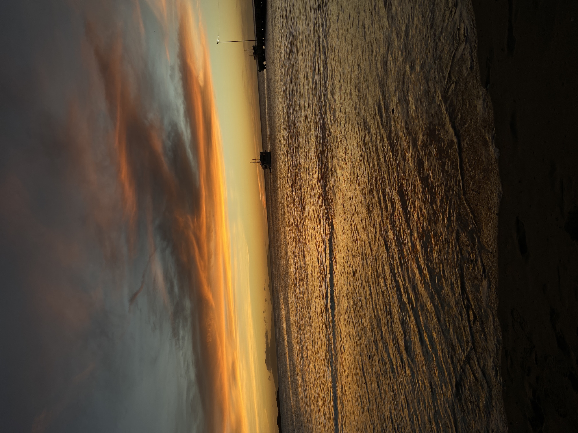 view of the sea from the beach in Juan Griego, Venezuela, at sunset. The sky is filled with clouds tinged with orange and grey. In the middle of the image, there's a pier with some small structures silhouetted against the orange horizon. The beach is on the right side, with sand that transitions from light to dark. The sea reflects the colors of the sunset. The photo is taken from a low angle.