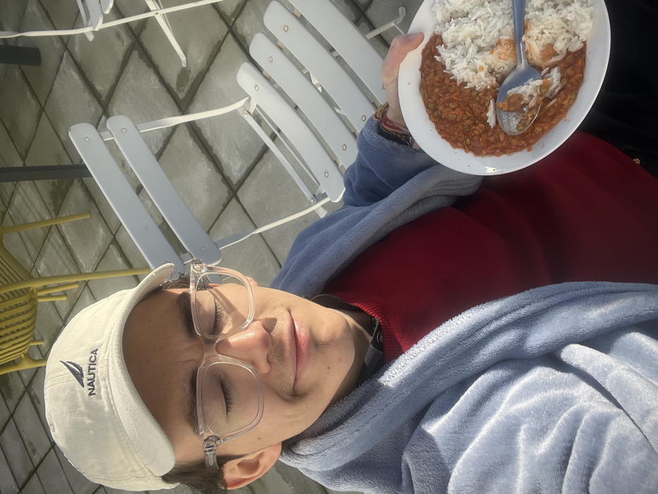A person is depicted in an outdoor setting, captured from the chest up, facing the camera with closed eyes and a slight smile. They wear a light beige Nautica baseball cap, clear-framed glasses, a red long-sleeved shirt, and a light blue fuzzy hooded robe. A multi-colored bracelet is visible on the left wrist. The individual holds a white, oval-shaped plate in their left hand, containing two distinct food items: a reddish-orange stew-like dish (possibly lentils) occupying the left side, and white rice on the right. A silver spoon rests within the food, partially submerged in the rice. The background consists of a patio paved with light gray square tiles, illuminated by strong sunlight which casts distinct shadows. Several white metal folding chairs are visible, along with one yellow metal chair further in the background. The location is Villeneuve-d'Ascq, France.