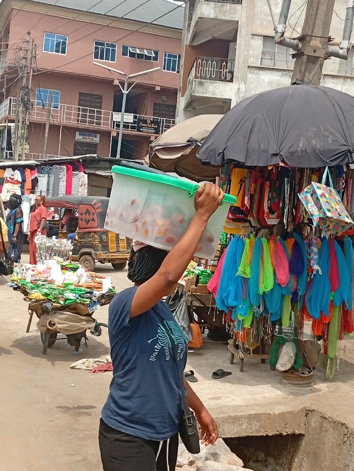 The image captures a vibrant street market scene in Onitsha, Nigeria, under bright daylight. In the foreground, a person, viewed from the right side, walks rightward while balancing a clear rectangular plastic container with a green lid, filled with light-colored, rounded food items, directly on their head. This individual wears a dark blue t-shirt featuring a white zebra graphic, black pants with a white drawstring, and carries a black shoulder bag on their left side. Their hair is styled in dark braids. To the immediate right of the foreground figure, a market stall is prominent, shaded by a large black umbrella. Numerous colorful mesh items, including shades of blue, green, pink, yellow, and orange, hang vertically from this stall, alongside several patterned gift bags. Two black sandals are visible on the ground directly beneath the stall. An open concrete drainage ditch, partially broken, runs along the right edge of the frame. In the midground, to the left, a mobile vendor cart is heavily loaded with various packaged goods such as bottles, sachets, and containers. Behind this cart, a yellow and black auto-rickshaw (Keke Napep) is present. Further back, indistinct figures of other people are visible, along with racks displaying clothing items for sale. The background consists of multi-story buildings. On the left, a light brown commercial building features multiple blue-tinted windows and displays signs for "FAVORITE HAIRICA," "DARREN MEDICAL," and "FANNY CAFÉ (FOOD)" on its lower levels. Adjacent to it on the right is a grey, concrete multi-story building with white metal balcony railings. Overhead, a utility pole with a complex network of power lines spans the scene. The ground surface is a light-colored, unpaved or dusty urban environment.
