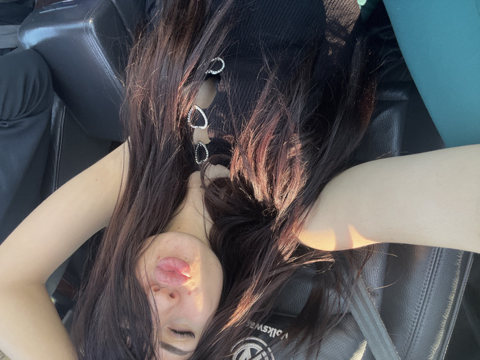A female subject is depicted from the chest up, positioned inside a vehicle, taking a selfie