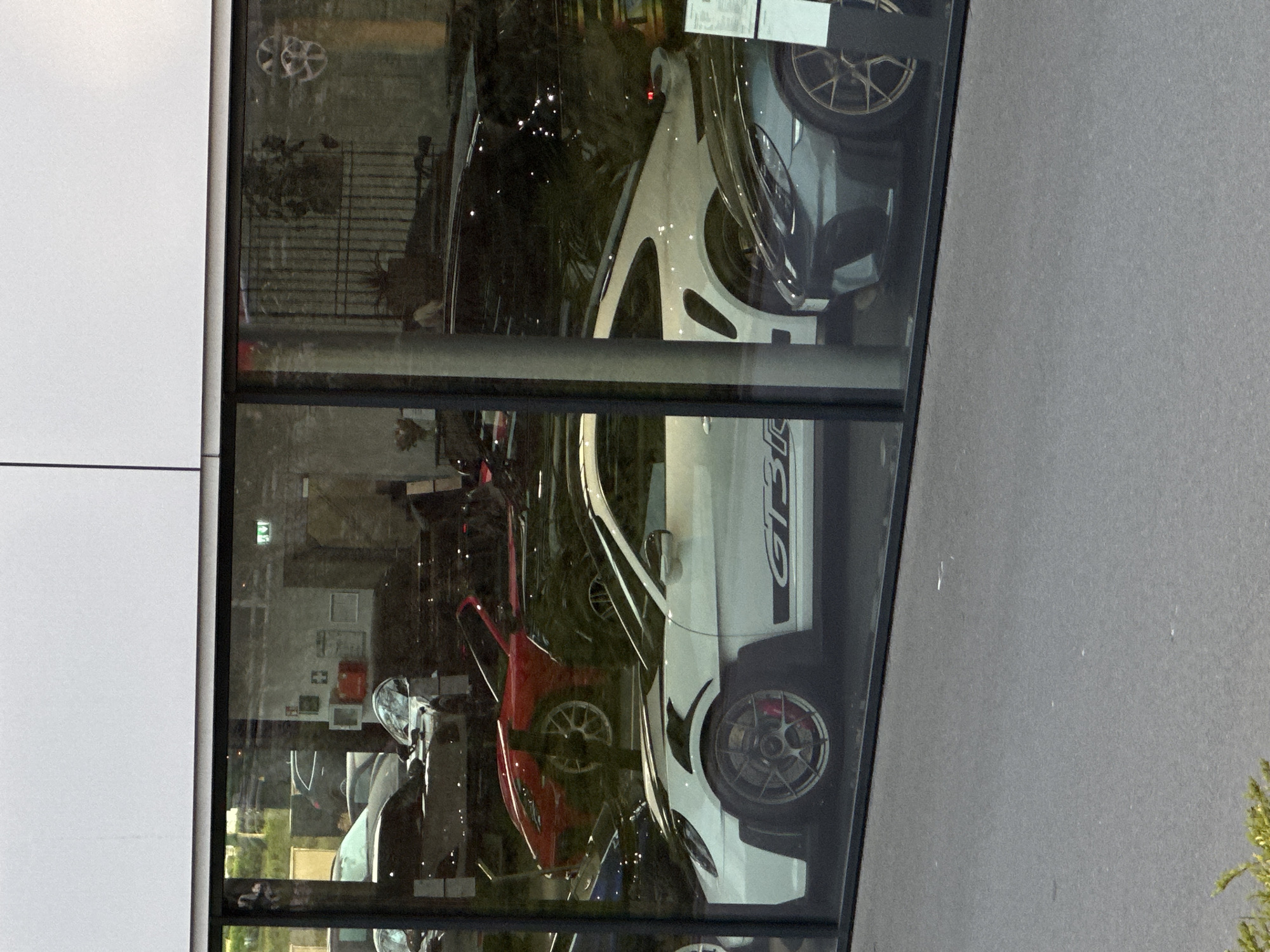 reflection of several cars in a showroom window. Based on the visible "GT3 RS" lettering, the cars are likely Porsche GT3 RS models. The reflection includes a red car and a white car. The window is part of a building with a gray exterior wall. The location is likely Holzwickede, Germany.