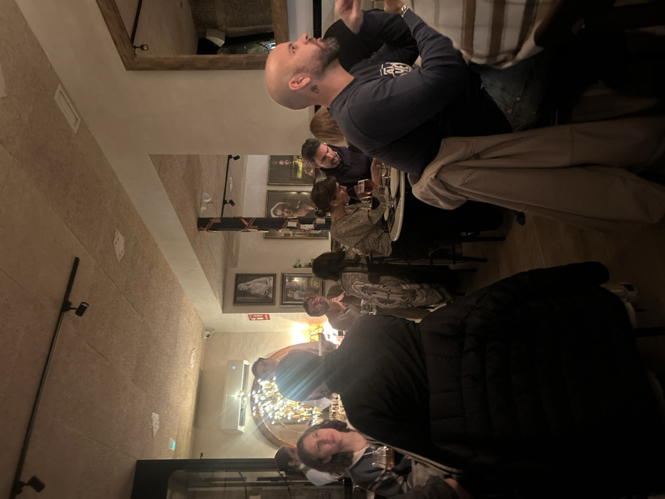A group of people sit at a long table in a restaurant. The table is set with drinks. Portraits hang on the wall behind them. A bald man with a tattoo on his neck sits at the head of the table. Another person in a black jacket is visible at the bottom of the frame. A chandelier is visible behind them.