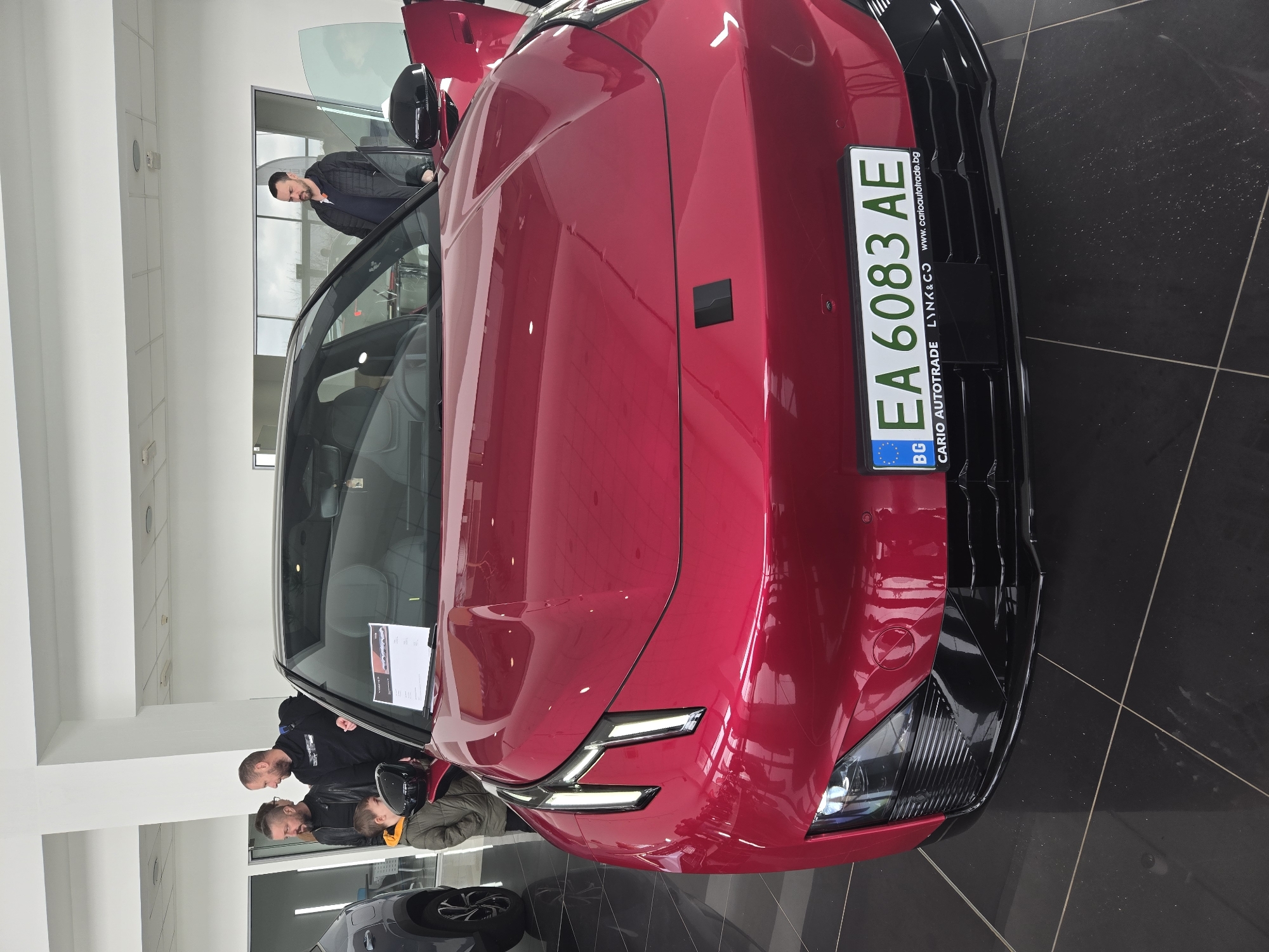 The image depicts the interior of a car showroom, identified as Cario Autotrade, located in Sofia, Bulgaria, based on the Bulgarian license plate and dealership branding. The central subject is a bright red Lynk & Co 07 EM-P sedan, displayed at an oblique angle, with its front passenger door open and distinctive vertical LED daytime running lights illuminated. The vehicle bears a Bulgarian registration plate "BG EA 6083 AE," with the frame explicitly stating "CARIO AUTOTRADE LYNX & CO www.carioautotrade.bg." Four individuals are present. On the left, two adult males and a young boy are observing the front left side of the vehicle. One man has a beard and top knot, wearing a black jacket. The second man, also bearded, wears a dark hoodie. The boy wears a green jacket with a yellow hood. On the right, a third adult male in a dark jacket is partially visible, standing near the open front passenger door, possibly interacting with the vehicle's interior. The showroom features a modern aesthetic with white walls, a white ceiling, and a reflective black tiled floor. A second, dark-colored SUV is partially visible on the far left. A white information sheet is affixed to the windshield of the red car.