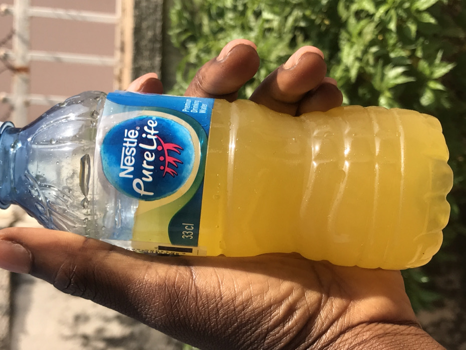 In Galadimawa, Nigeria, an outdoor scene under direct sunlight depicts a dark-skinned human hand holding a 33 cl clear plastic bottle. The bottle, featuring a light blue cap and ribbed body, displays a "Nestle Pure Life" label with "Premium Drinking Water" text and a stylized red figure emblem. The bottle contains a yellow-orange, opaque liquid, distinct from clear water. Condensation is visible on the bottle's exterior. The background is blurred, showing green foliage on the right and a light-colored wall or structure with a dark, patterned element on the left.