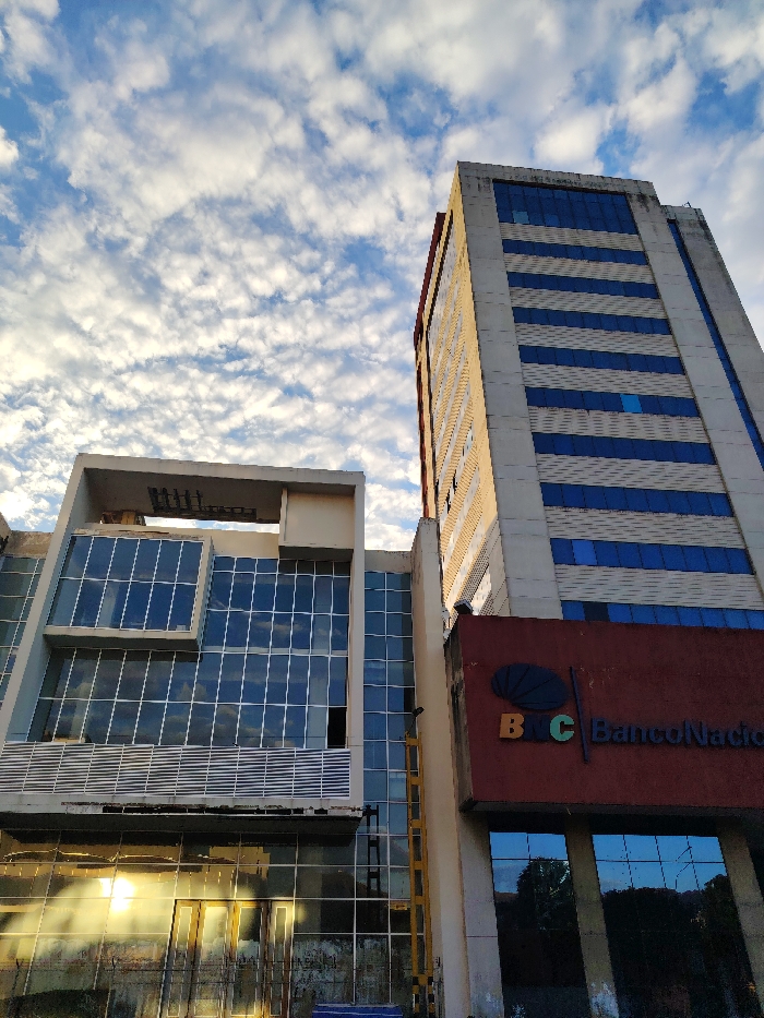 Two buildings reach into a partly cloudy sky. One building features a modern design with large glass windows and a square structure on top. Next to it, a taller, older building has horizontal blue stripes running across its facade. A red sign with "BNC Banco Nacional" is visible on the side of the second building. The windows of the lower floors reflect trees or other greenery. The buildings appear to be in an urban environment.