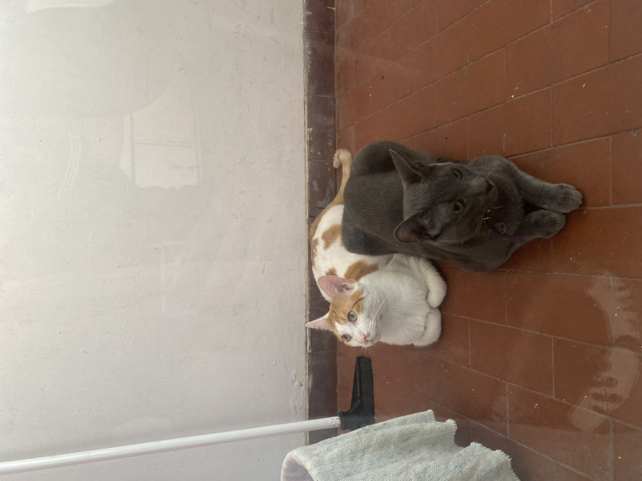 Two cats rest on a red-tiled floor near a white wall and a drying rack with a white towel. One cat is a solid gray, lying stretched out on top of the other. The other cat is white with orange markings and is curled up below. Both cats face the camera.
