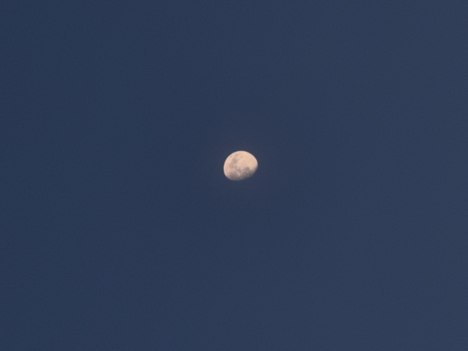 A daytime shot captures a three-quarter moon suspended in a clear, deep-blue sky