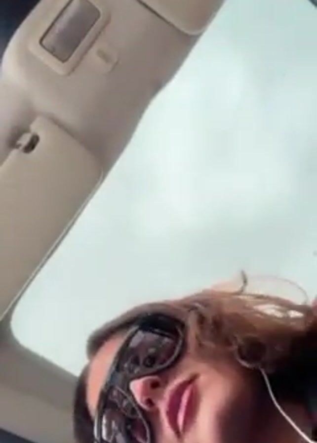 person wearing sunglasses and earphones from a low angle in a car. The person is looking up at the sunroof, their face and mouth visible. The car's interior is visible, including the sun visors and headliner. The person sticks their tongue out briefly. The sky is visible through the sunroof, appearing overcast.