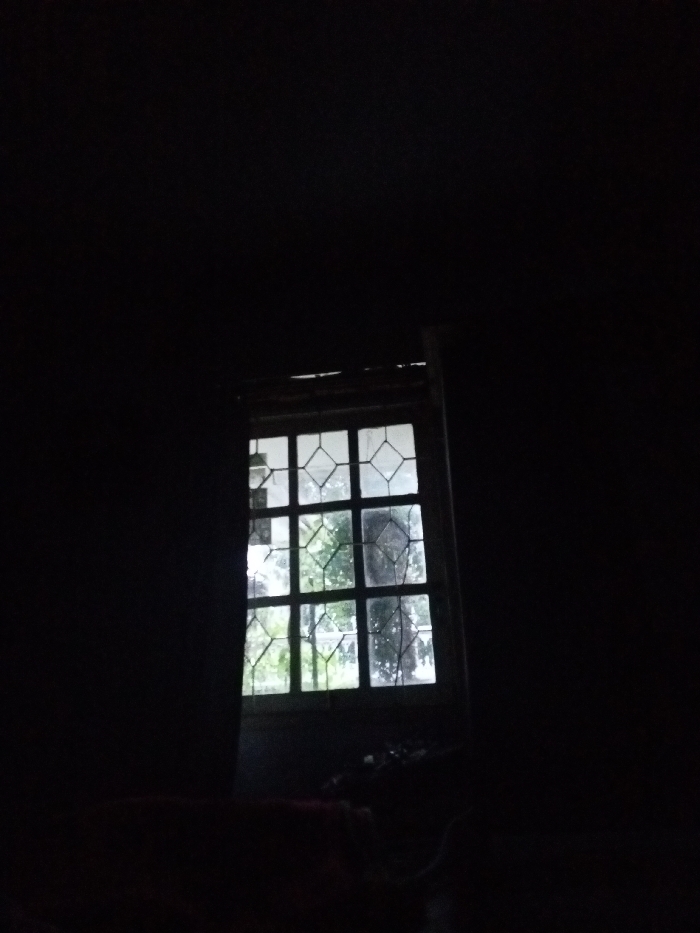 This image depicts an interior scene in Qorday, Kazakhstan, characterized by extreme low light. A rectangular, multi-pane window is centrally positioned, acting as the primary light source for the otherwise dark room. The window features a grid of horizontal and vertical muntins dividing it into multiple panes, further enhanced by an overlaying decorative metalwork or grille forming a pattern of smaller, approximately diamond-shaped divisions. Through the window, green foliage, consistent with trees or bushes, is visible, indicating an outdoor natural environment under daylight. The interior foreground reveals indistinct dark shapes; a dark red or maroon object is partially visible on the lower left, and other unidentifiable objects are present beneath the window sill. No individuals or discernible actions are present within the frame.