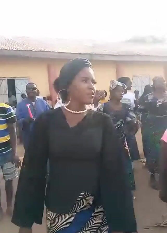 A group of people are gathered outdoors in front of a building. A woman in a black top, patterned blue skirt, and head covering is in the foreground, looking to the side. Behind her, a crowd of people are dancing or moving together. Many of them are wearing similar blue and green patterned skirts. The building behind them is a light tan color with white-trimmed windows. A man in sunglasses and a blue outfit stands near the building. The ground appears to be dirt.