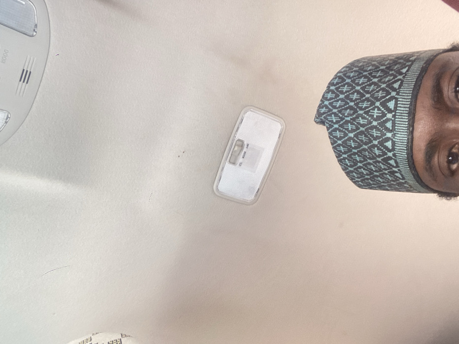 A low-angle shot reveals a car's interior roof. To the left, a dome light fixture is visible, followed by an interior light fixture. A small scattering of black specks is seen in the center. The right side of the frame features a person, only the top of their head and eyes are visible, wearing a patterned kufi. The roof's color is a light neutral shade.