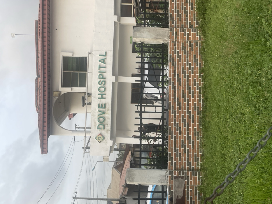 The image displays the exterior of "DOVE HOSPITAL" in Ado, Nigeria, under an overcast sky