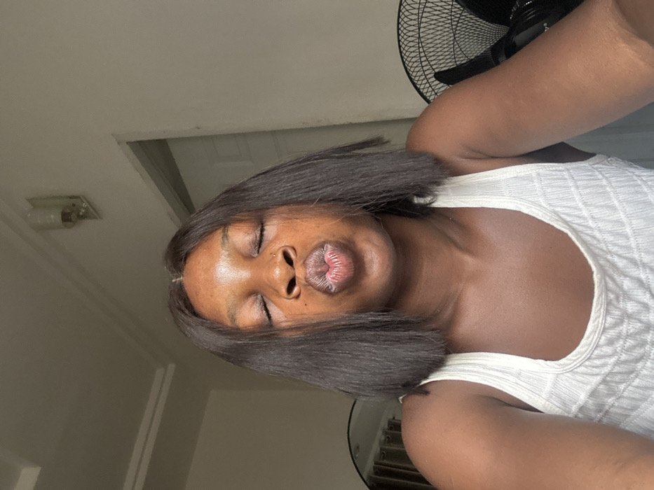 A medium-close-up image depicts a young woman in an indoor setting within the city of Abuja, Nigeria. The woman, who has a medium-dark skin tone and shoulder-length dark hair with a central part, is positioned facing the camera. Her eyes are closed, and her lips are pursed in a distinct 'kiss' or 'pout' gesture. A small silver stud pierces her right nostril. She is wearing a light-colored, possibly white or cream, ribbed tank top. The background consists of light-colored walls, with crown molding visible along the top. A wall-mounted light fixture with a glass shade is affixed to the upper right quadrant of the wall. To the left, a dark-framed, arch-shaped mirror or decorative panel is partially visible. On the far right, a portion of a black electric standing fan is discernible. A partial view of a doorway or internal archway is also visible on the right side of the background. The lighting in the room appears to be ambient, likely from an unseen natural light source or general room illumination. The overall scene suggests a personal, domestic environment.