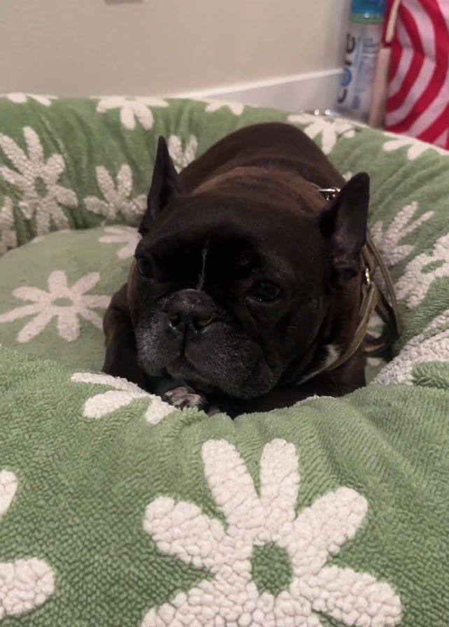- "dark-colored French Bulldog lying in a round dog bed with a green and white floral pattern" by FM-iuyA43, licensed under CC BY 4.0