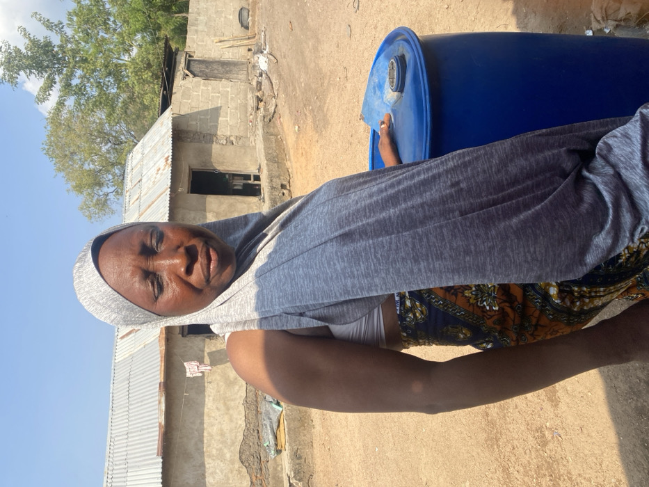 An adult female stands outdoors in Egbu, Nigeria, on a clear, sunny day. She is positioned slightly left of center, wearing a light grey head covering, a light-colored top, and a dark blue patterned wrapper with yellow and orange designs. Her eyes are partially closed. Her right hand rests on the light blue lid of a large, blue plastic barrel, which features a black screw cap. In the background, two single-story structures with corrugated metal roofs are visible. The closer building, made of concrete or mud, has an open doorway and light-colored laundry hanging outside. The second structure, constructed from concrete blocks, has a closed wooden door. The ground is dry, light brown earth. A large green tree is visible in the upper right background, and various items of debris are scattered on the ground.
