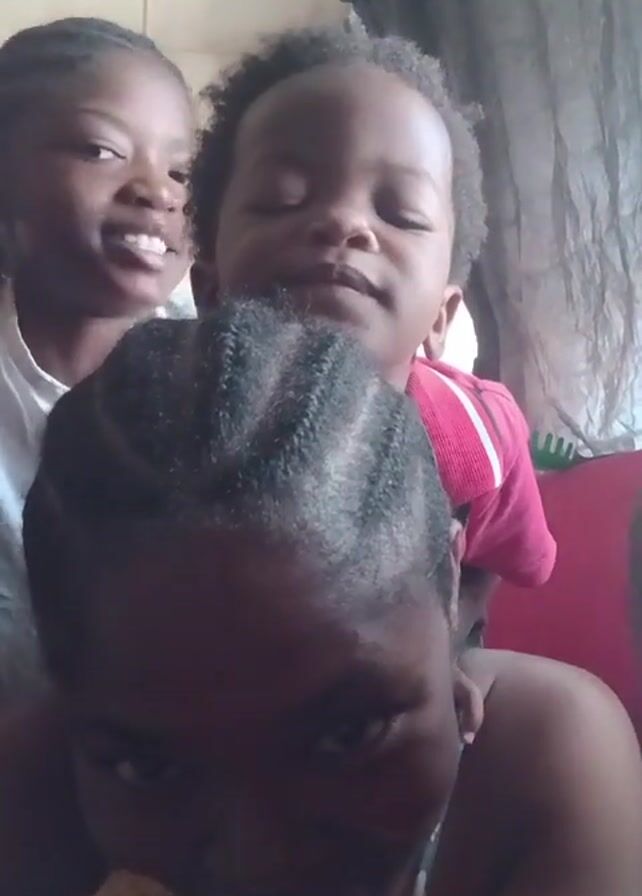 four people taking a selfie. The one in the foreground is smiling and has braided hair. The person behind her is a child with short curly hair. The person behind them is a young girl with braided hair who is also smiling. There is also a fourth person whose head is only partially visible on the right. The background is a room with white walls, a window with a curtain, and part of a red couch.