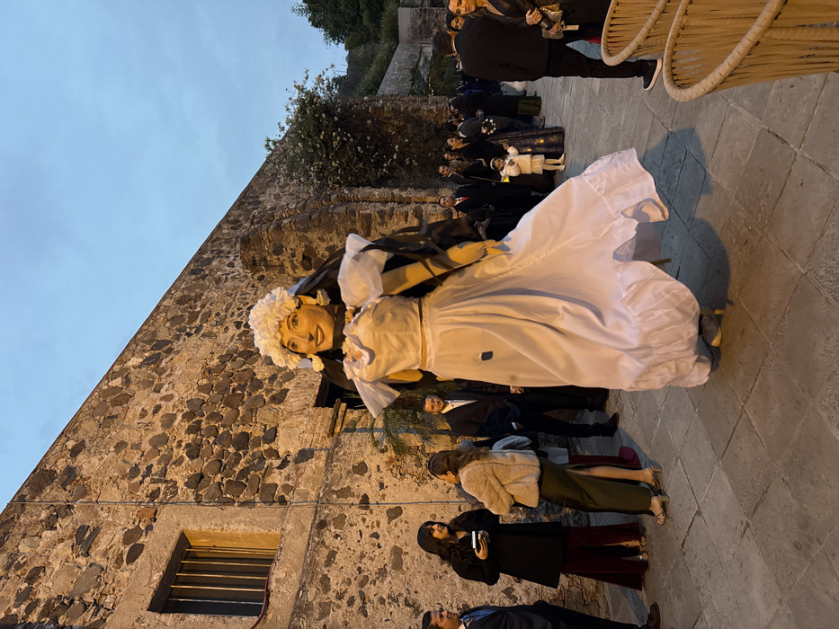 A large marionette of a woman in a white dress and floral headpiece stands among a crowd of people on a stone-paved ground. The marionette's face is visible, displaying a smile. A stone building is in the background. Some attendees are dressed in formal attire, while others appear more casually dressed. The photo is taken outdoors in dim lighting.