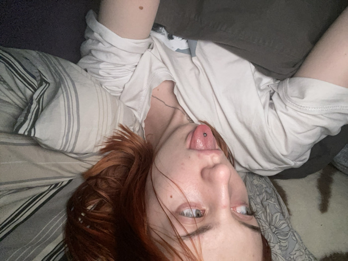 A young adult individual with reddish-brown hair is depicted in an indoor setting in the city of Engels, Russia. The subject is oriented horizontally, with their head resting on pillows; one pillow behind the head exhibits a floral or abstract pattern, while another to the right features horizontal stripes. The subject is wearing a light-colored, short-sleeved t-shirt, with a dark textile material partially covering the lower body. A small, dark brown nevus is visible on the inner aspect of the subject's right arm. The subject's light-colored eyes are directed upwards and to the left, and their tongue is protruded from the mouth, displaying a metallic barbell piercing. A thin metallic chain is partially visible around the subject's neck. Striped bedding is visible to the right of the subject's head.