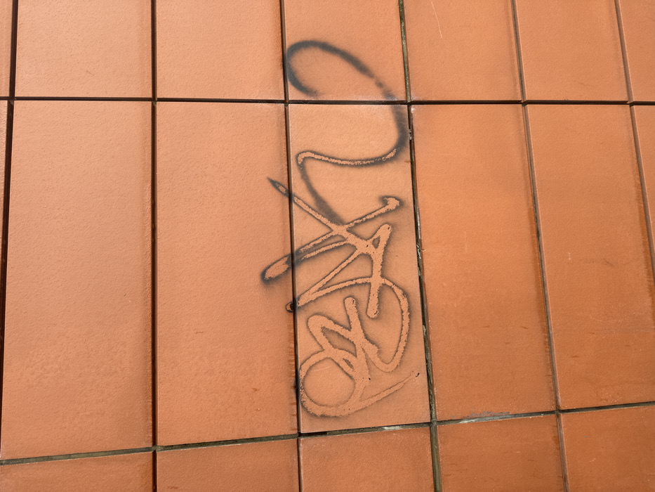 The image depicts a section of a wall faced with uniform, horizontally aligned, rectangular terracotta-colored tiles, separated by dark grout lines. On the middle horizontal row of tiles, a single piece of black spray-painted graffiti is visible. The graffiti appears to be a tag or stylized signature, featuring a series of connected, cursive-like letters or symbols that are roughly centered within the frame. The spray paint application is somewhat translucent, revealing the underlying tile color, and exhibits minor overspray around the edges of the lines. There are no people, other subjects, objects, or actions visible in the scene. The location is in the city of Manchester, United Kingdom.