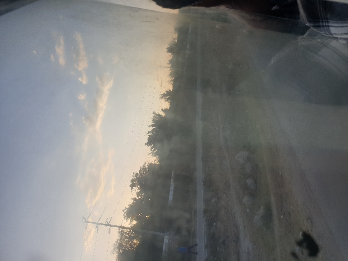A landscape view through a misty or unclear surface captures a partly cloudy sky. A roadside with vegetation and trees lines the right side of the frame. Power lines and poles extend towards the hazy horizon. A small figure of a person is visible along the road, indicating a sense of scale. The image's overall tone is subdued due to the atmospheric distortion.