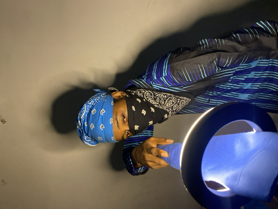 A person is angled to the right, with part of their face covered by a black paisley bandana. A blue bandana covers the head. The individual wears a blue and black striped shirt. The person's hand is wrapped in a blue bandage, held up to a ring light. The background is a plain, dimly lit wall.