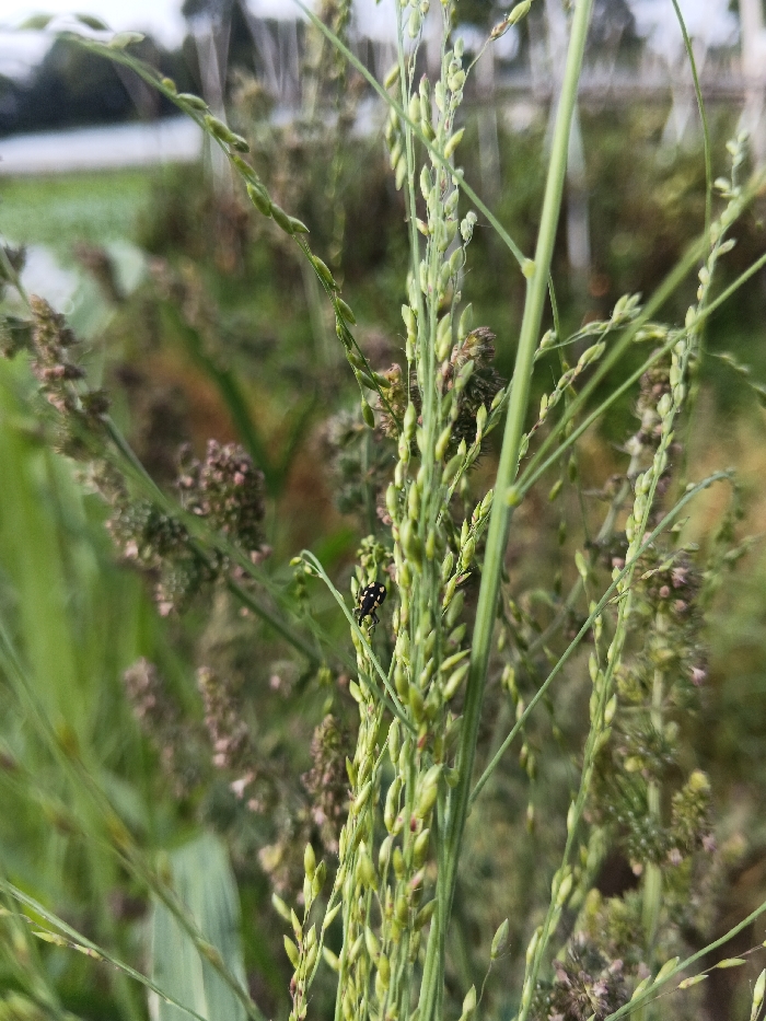 A close-up shows various green plants with long, thin stems and seed heads. One stem has a small black and yellow beetle crawling on it. Other flowering plants are visible in the background. The scene is outdoors, likely a field or garden, with a blurry backdrop suggesting a bright, overcast day.