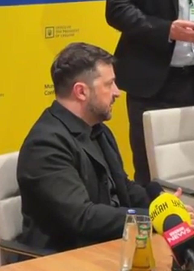 Volodymyr Zelenskyy, president of Ukraine, is sitting at a table, giving an interview to members of the press