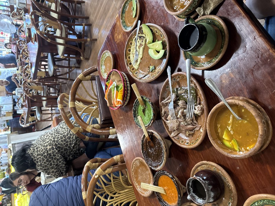 A table is set with an array of clay bowls and plates containing various foods, including what appears to be shredded meat, soup with avocado, tortillas, a collection of colorful sauces, and a beverage in a ceramic cup. The table is surrounded by wooden chairs, and patrons are visible in the background of a restaurant setting.
