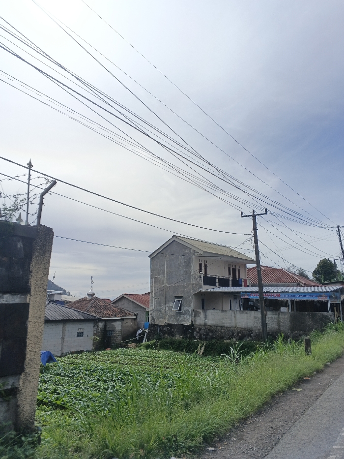 A gray two-story house with a small balcony stands near a lush green field, bordered by overgrown grass along a narrow road. Utility poles and wires stretch across a cloudy sky. Adjacent houses with reddish-brown tiled roofs and a small mosque can be seen. A weathered concrete wall with barbed wire stands in the foreground. The scene is taken from a ground-level perspective.
