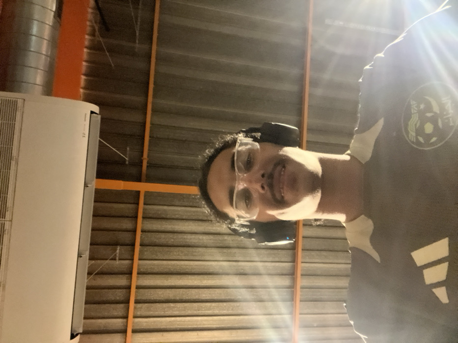 The image depicts a male subject in what appears to be an indoor facility in Strasbourg, France. The subject, a young adult with dark, curly hair, a mustache, and clear-framed eyeglasses, looks directly at the camera with a slight smile. He is wearing black over-ear headphones and a dark-colored sports jersey featuring a light-colored collar. The jersey displays a white Adidas logo on the left chest and a circular emblem with the text "FAF" and "الجزائر" (Algeria) on the right chest, indicating a connection to the Algerian Football Federation. The background consists of a corrugated metal wall or ceiling, accented by orange-colored structural beams running horizontally and vertically. A white air conditioning unit is mounted on the upper left. A strong light source from the right side of the frame causes lens flare in the lower right quadrant.