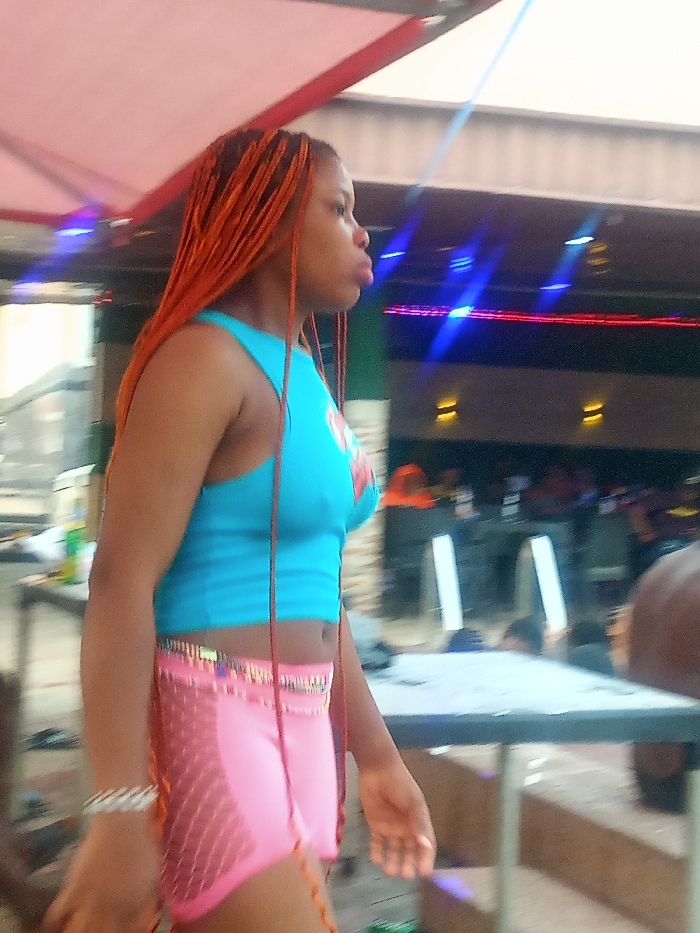 A young, dark-skinned woman with bright orange braided hair stands in an outdoor setting. She wears a turquoise tank top and pink shorts with a decorative beaded belt. A silver bracelet is visible on her wrist. In the background, there are tables, chairs, and other people, suggesting a public space like a bar or restaurant. Blue and red lights illuminate the indoor part of the venue.