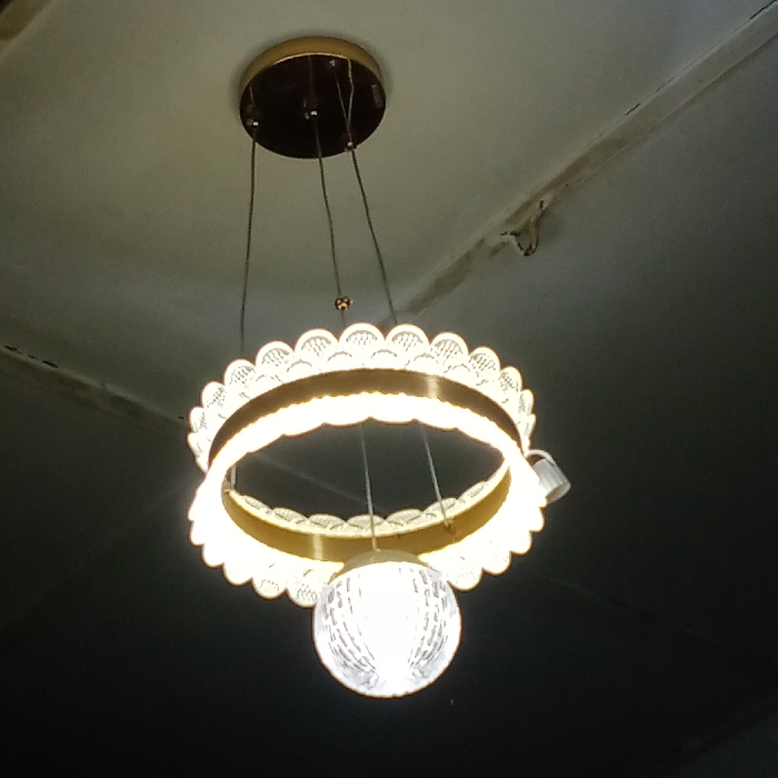 A ceiling-mounted light fixture dominates the image. It features a circular, ornate golden frame emitting a bright light, enhanced by a decorative pattern along its edge. The frame suspends a translucent, globe-shaped light bulb that appears intensely luminous. Thin wires connect the fixture to a dark ceiling mount. The surrounding ceiling appears dull and aged.