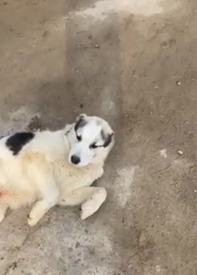 A single person's foot in a gray slip-on shoe is visible at the bottom of the frame. A white dog with black patches lies on its side on the ground. The ground is packed dirt with some lighter colored patches. The dog appears to be relaxed and unmoving. The person moves their foot towards the dog.