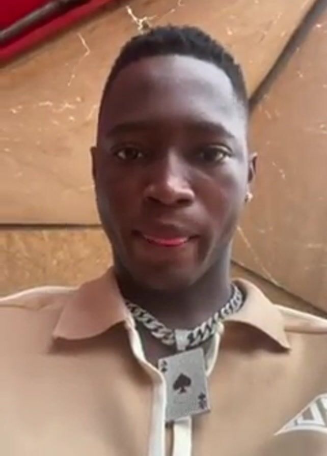 young Black man from the chest up. He has a short haircut and is wearing a tan polo shirt with white accents. Around his neck, he wears a thick silver chain with a large, bedazzled Ace of Spades pendant. He appears to be under a red and white awning. He looks directly at the camera, occasionally glancing slightly to his left. He also touches his shirt at one point.