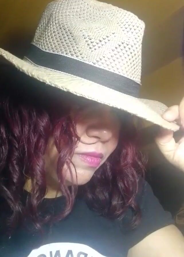 A woman with reddish curly hair is wearing a black t-shirt with a white logo and a beige fedora with a black band. The woman's face is partially obscured by the hat, but her nose and pink lips are visible. She is holding the hat's brim. The background is a plain yellow wall.