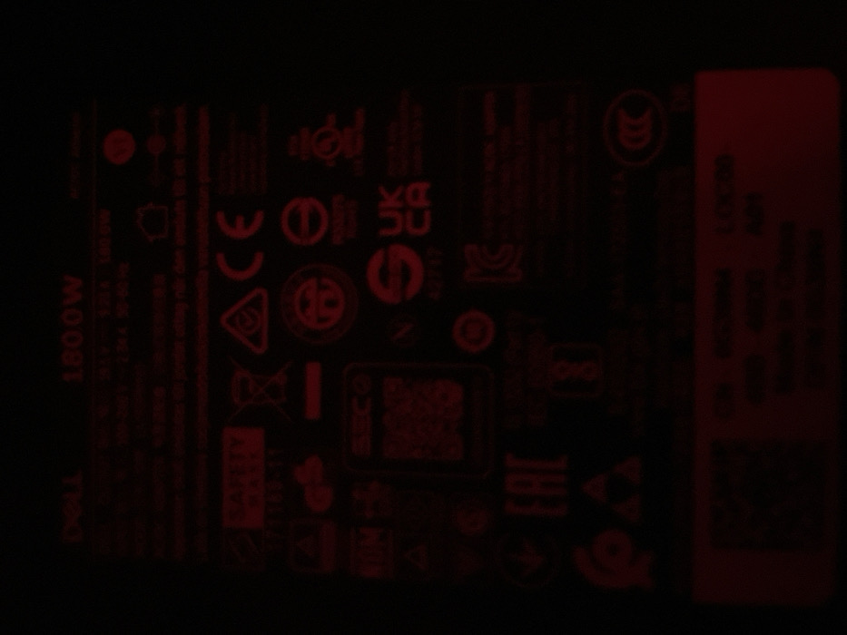 dark, red-toned label, likely from a Dell product, possibly a power supply unit. "DELL 1800W" is visible. The label includes numerous regulatory and safety certifications, alongside a QR code. The text is difficult to read due to the darkness and color. A vertical section on the right side contains more text and another QR code.