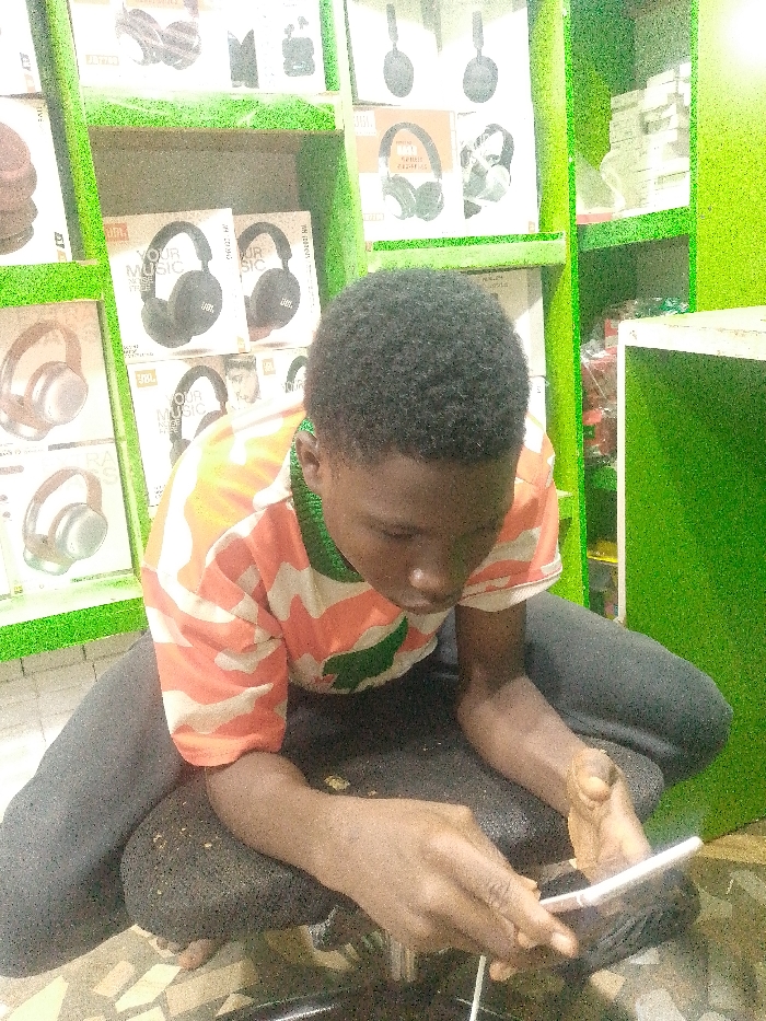 A young person is crouched down, absorbed in a smartphone screen. They are wearing a striped shirt and dark pants. The setting appears to be inside a shop, with shelves filled with boxes of headphones visible in the background. The area around the person is slightly cluttered and the overall lighting is muted, highlighting the phone as the primary focus of attention.