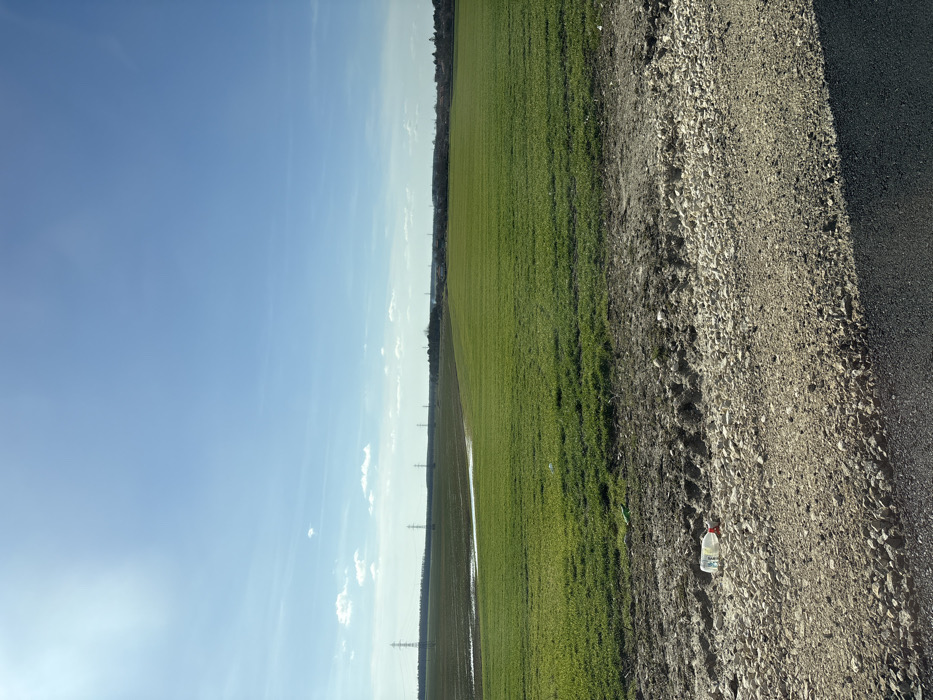 The scene depicts a rural landscape near the city of Senokos, Bulgaria, under a clear, bright blue sky with sparse white clouds. The sun is visible in the upper left quadrant. In the immediate foreground, a strip of dark asphalt pavement transitions to a wider section of light-colored gravel and dirt, featuring distinct tire tracks. A clear plastic bottle with a red cap lies horizontally on the gravel. Adjacent to this foreground strip, a large, cultivated field of vibrant green, low-lying vegetation occupies the midground, extending towards the horizon. To the left of the green field, a darker, possibly tilled or muddy field contains a prominent, irregular-shaped puddle of standing water. In the distant background, a series of tall electricity pylons with power lines traverses the horizon from left to center, above a faint treeline or dense vegetation. Further right, a distant cluster of structures suggests a small settlement or buildings behind the vegetation. No individuals or active subjects are present in the frame.