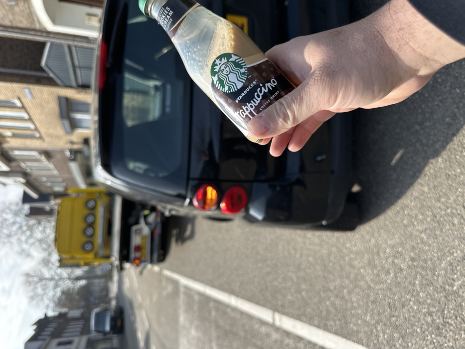 - "A right hand, belonging to an individual not fully visible, holds a partially consumed glass bottle of Starbucks Frappuccino "Cookies & Cream Flavour" coffee drink" by FM-cmwts1, licensed under CC BY 4.0