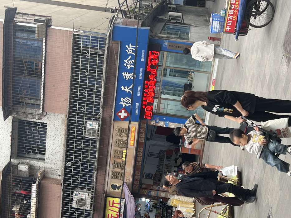 The scene depicts a bustling urban street in the city of Jiangjin, China, observed during daytime under an overcast sky. The background is dominated by a multi-story building featuring lower levels clad in brown brick and an upper section with a lighter, textured facade. Numerous windows on the building are secured with white metal security bars, and several external air conditioning units are mounted on the walls. At street level, two commercial establishments are visible: on the left, "勇真照像馆" (Yong Zhen Photo Studio) with a yellow sign, and centrally, "杨天素诊所" (Yang Tiansu Clinic) with a prominent blue sign displaying a red cross and white Chinese characters. Below the clinic sign, a red LED display scrolls Chinese text. Both businesses have glass storefronts, with the photo studio's interior showing picture frames and the clinic appearing brightly lit. Eight individuals are present on the paved street. In the foreground, a woman wearing a black shirt with a "NASA" logo and black pants stands, holding the handle of a dark-colored baby stroller. A young child, wearing a light-colored shirt and blue jeans, sits in the stroller, looking forward and slightly left. A white bag hangs from the stroller's handle. To the left of the stroller, a man in a black suit jacket, dark pants, and dark shoes stands facing right, with his right hand slightly raised. Near him, an older woman in a striped top is bent over, appearing to handle goods within white plastic bags, positioned next to a traditional wooden carrying pole. Further back, a man in a horizontally striped short-sleeved shirt and dark pants stands with his hands on his hips, looking towards the right. On the far right, a man in a light-colored hooded jacket and pants walks away from the viewer. Behind him, a red fire hydrant is visible. A three-wheeled street cart is positioned on the far right, partially covered by a blue tarp. A sign on the cart displays "中山古镇石" (Zhongshan Guzhen Stone) and pricing information. Blue plastic crates, one containing white items, are stacked on the cart. Electrical cables are visible in the upper right portion of the frame.