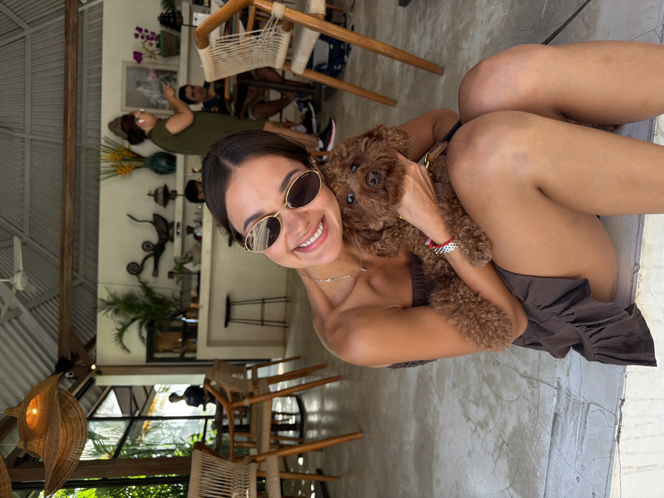 A smiling woman with oval sunglasses holds a small, brown, fluffy dog. She wears a brown top and a necklace. The background shows an open-air restaurant with wicker furniture, decorations on a wall, and other people in the distance. The image is rotated.