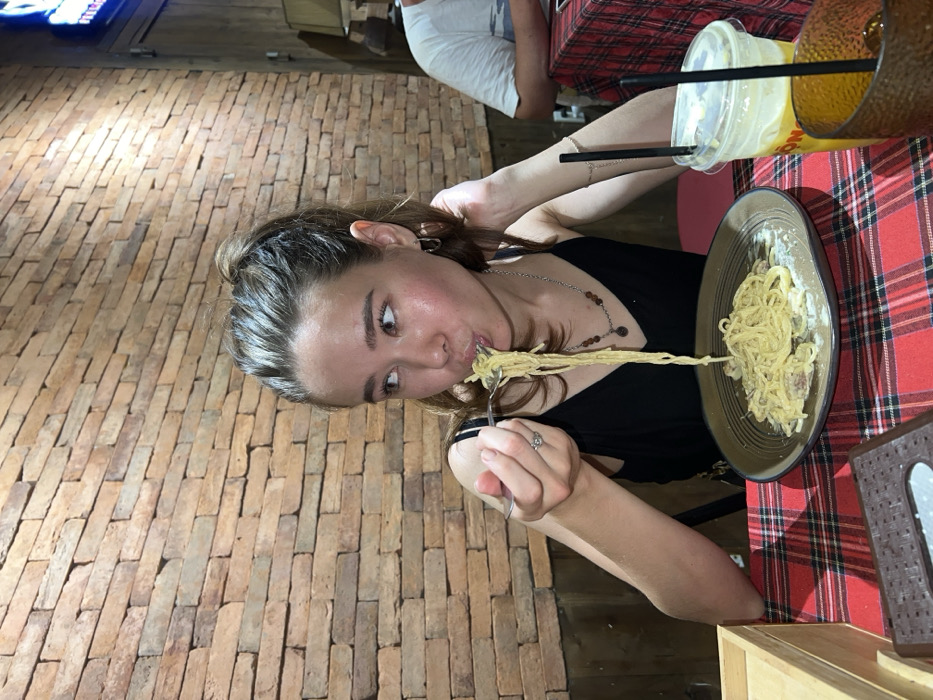 The image depicts an indoor dining scene within a restaurant in Nha Trang, Vietnam. A young woman with light brown hair tied in a ponytail is the central subject, actively eating pasta from a dark-colored shallow bowl using a silver fork in her left hand. She wears a black spaghetti strap top, a silver ring on her left ring finger, small hoop earrings, and a beaded necklace with a dark pendant. Her mouth is open as she brings a long strand of pasta to her lips, and her gaze is directed towards the right, off-camera. The table is covered with a red and black plaid tablecloth. Beside her pasta, a clear plastic cup containing a yellow liquid with a black straw is visible; partial text "NÓN" is discernible on the cup. To its right, a brown textured glass with another black straw contains a small amount of liquid. A wooden box and a dark brown rectangular object rest on the table's left side. To the right of the central figure, a light-skinned male wearing a white t-shirt is partially visible, seated at an adjacent table. The background consists primarily of a light brown brick wall, with dark wooden paneling below it on the far left. Overhead lighting illuminates the scene. A blue neon sign and a lamp with a dark lampshade are partially visible in the upper right background.