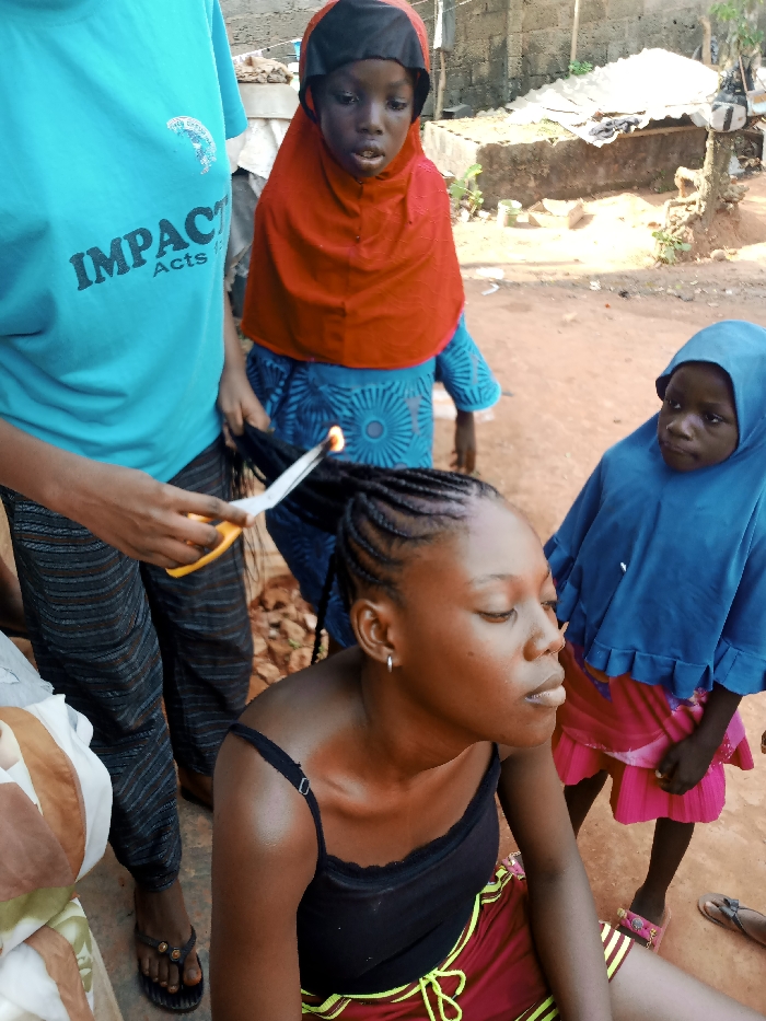 An outdoor scene in Lagos, Nigeria, depicts four individuals engaged in or observing a hair styling activity. In the foreground, a young woman, identified as the client, sits with her eyes closed. She wears a black spaghetti strap top and red shorts with yellow drawstrings; her dark hair is styled in multiple cornrows. To her left, partially visible, stands a person in a turquoise t-shirt bearing the text "IMPACT Acts" and dark striped pants, wearing black flip-flops. This individual holds a yellow lighter in their right hand, using a pair of silver scissors to direct the flame to seal the end of a dark hair braid on the client's head. Two young girls are observing the process. A girl positioned behind the client wears a red hijab over a blue patterned dress and has her mouth slightly open. To the right of the client, another younger girl stands, wearing a blue hijab over a pink skirt, looking towards the action. The ground beneath them is unpaved, reddish-brown dirt. The background reveals a residential area characterized by simple, weathered structures constructed from concrete blocks and corrugated iron sheets, indicative of an informal or low-income urban settlement under direct sunlight.
